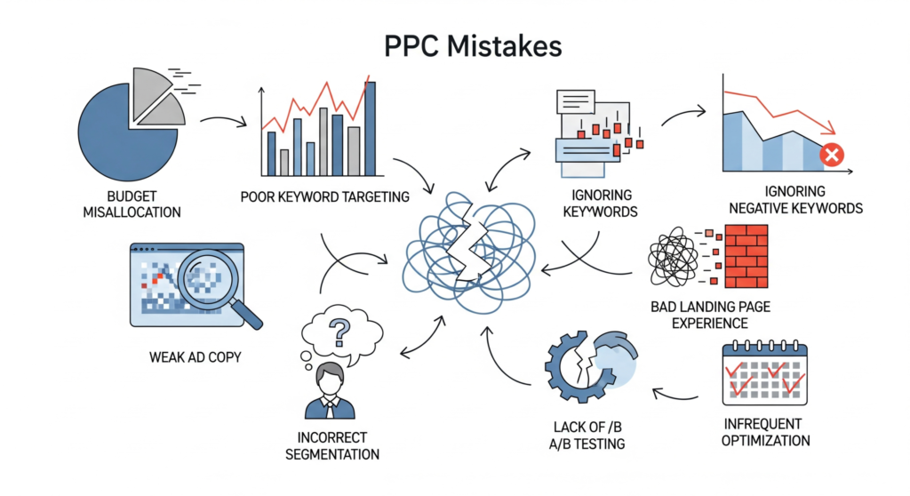Google Ads remains one of the major platforms, offering a wide reach to the audience. Pay-per-click (PPC) advertisements create immediate business opportunities by driving more traffic and conversions. However, how you run ads using PPC is everything. If your targeting is wrong, your ad may not reach potential customers for your business. If your ad strategy is not strong enough, you may be wasting your advertising budget on unnecessary marketing campaigns. Like these, there are many mistakes that businesses make when it comes to PPC. Google Ads lets brands thrive in a competitive business environment as it allows for increased brand recognition and has the potential to catch viewers’ attention. In this blog, we will look at some of the common PPC mistakes businesses are still making that hurt their marketing spend and conversions.